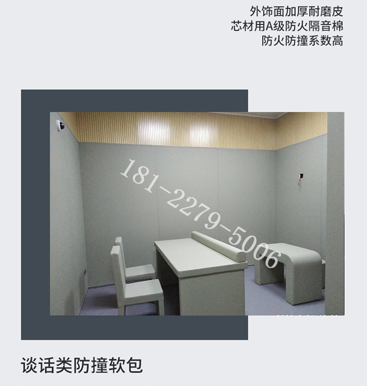 審訊室防撞軟包,是一種獨特的阻燃防撞材料,兼具阻燃、環(huán)保、防水、防撞四大特點,目前還廣泛應(yīng)用在紀(jì)檢委、派出所、看守所、監(jiān)獄、拘留所、談話室、留置室、詢問室、辨認(rèn)室、辦案區(qū)、衛(wèi)生間等機(jī)關(guān)場所。具有阻燃、環(huán)保、防水、防撞+吸音板安裝可以達(dá)到吸音效果。